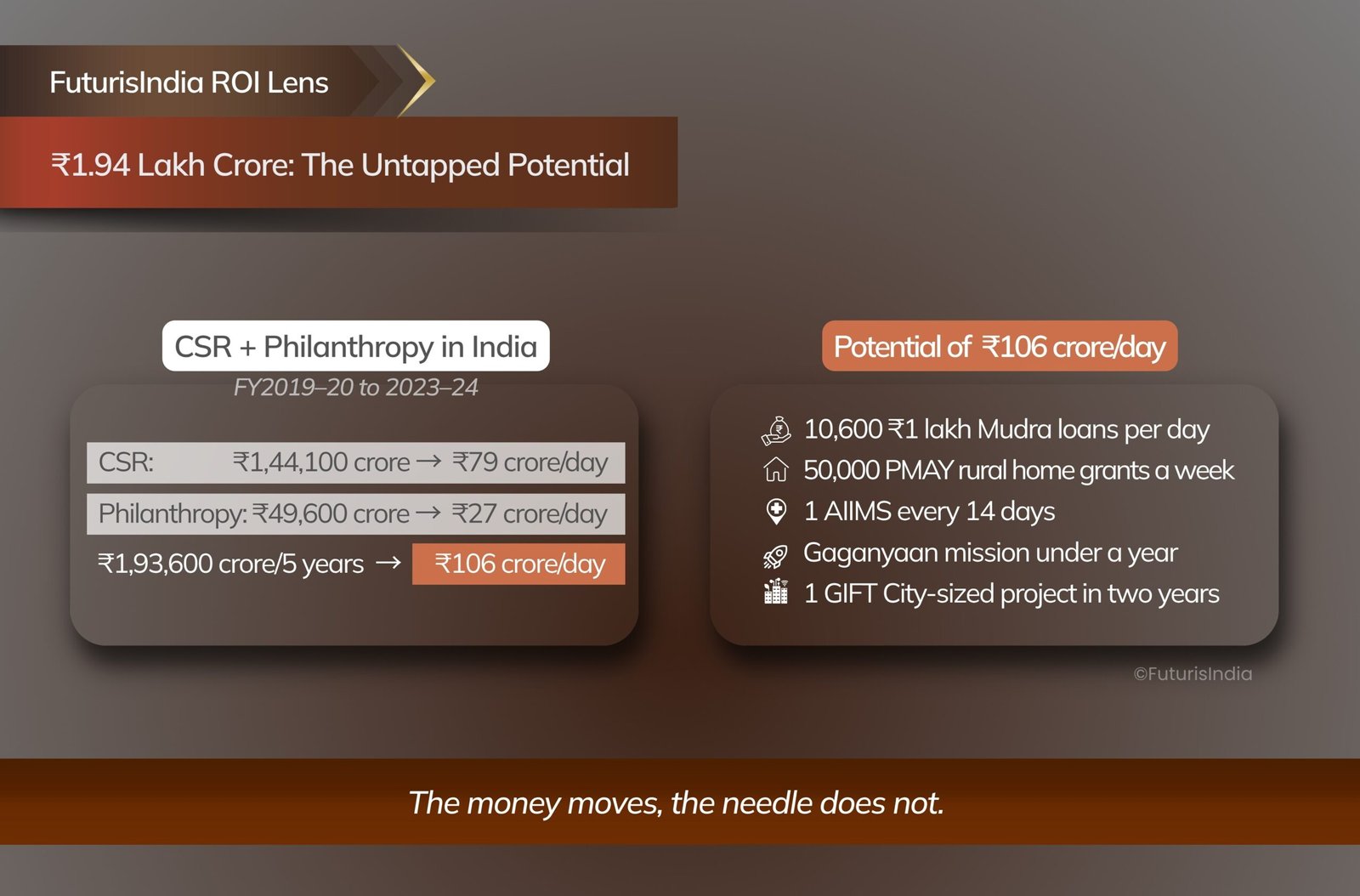 FuturisIndia reframes CSR and Philanthropy as Transformation Capital, a catalyst for nation-building. It gives a strategic identity to what is otherwise seen as compliance or charity, and calls for catalytic returns for all stakeholders – nation, public, and contributors.