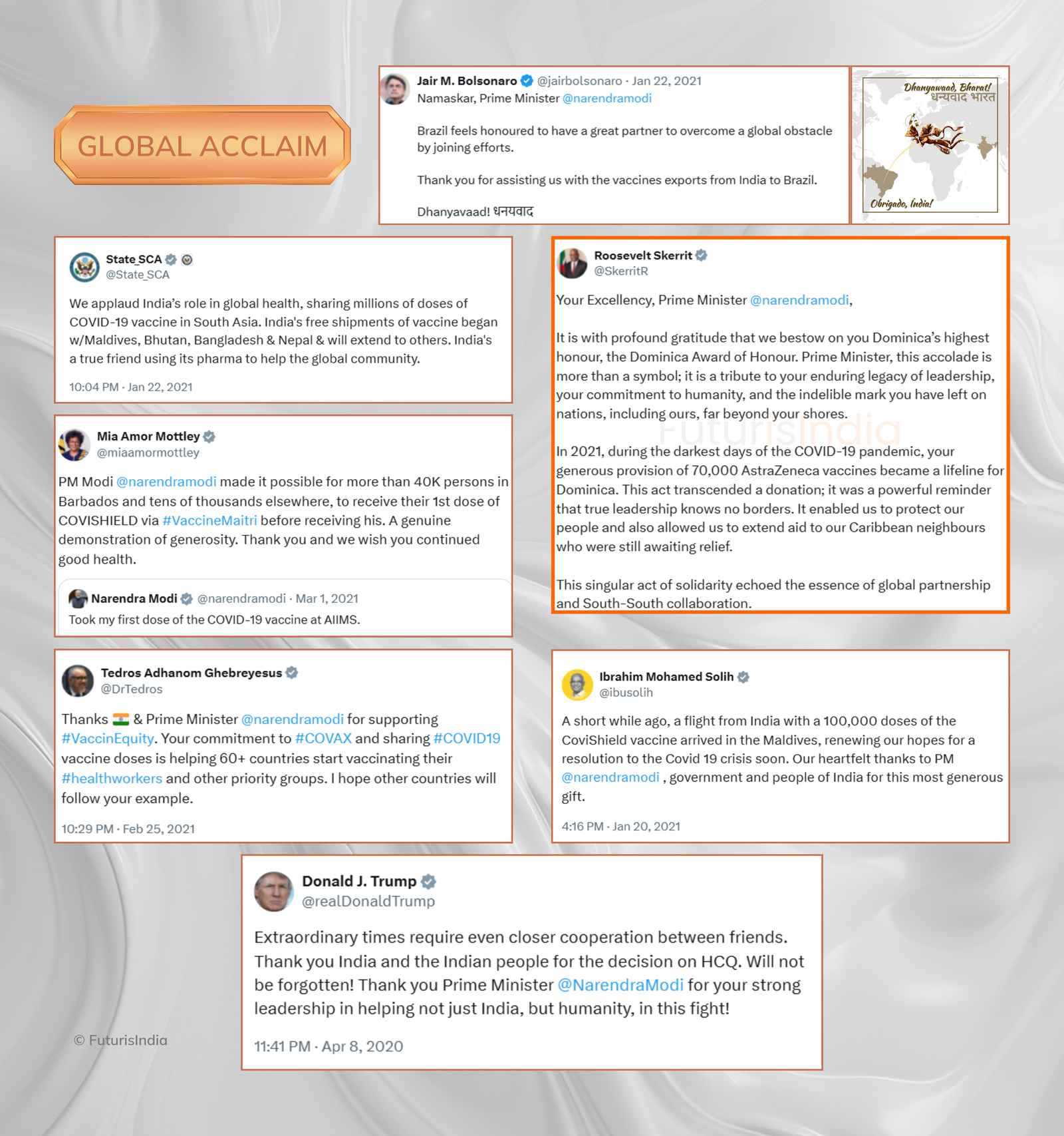 Dominica PM Roosevelt Skerrit posted on a social media platform, “Even though I trust every word of the bible, I must confess that I did not imagine that the prayers of my country would have been answered so swiftly. Thank You India.” While receiving the vaccines sent by India at the airport, he said, “One would have thought and understood that in a global pandemic such as this, a nation’s size and might would have been the primary considerations. But it is to the credit of Prime Minister Narendra Modi that our request was considered on merit and the equality of our people was recognised.”