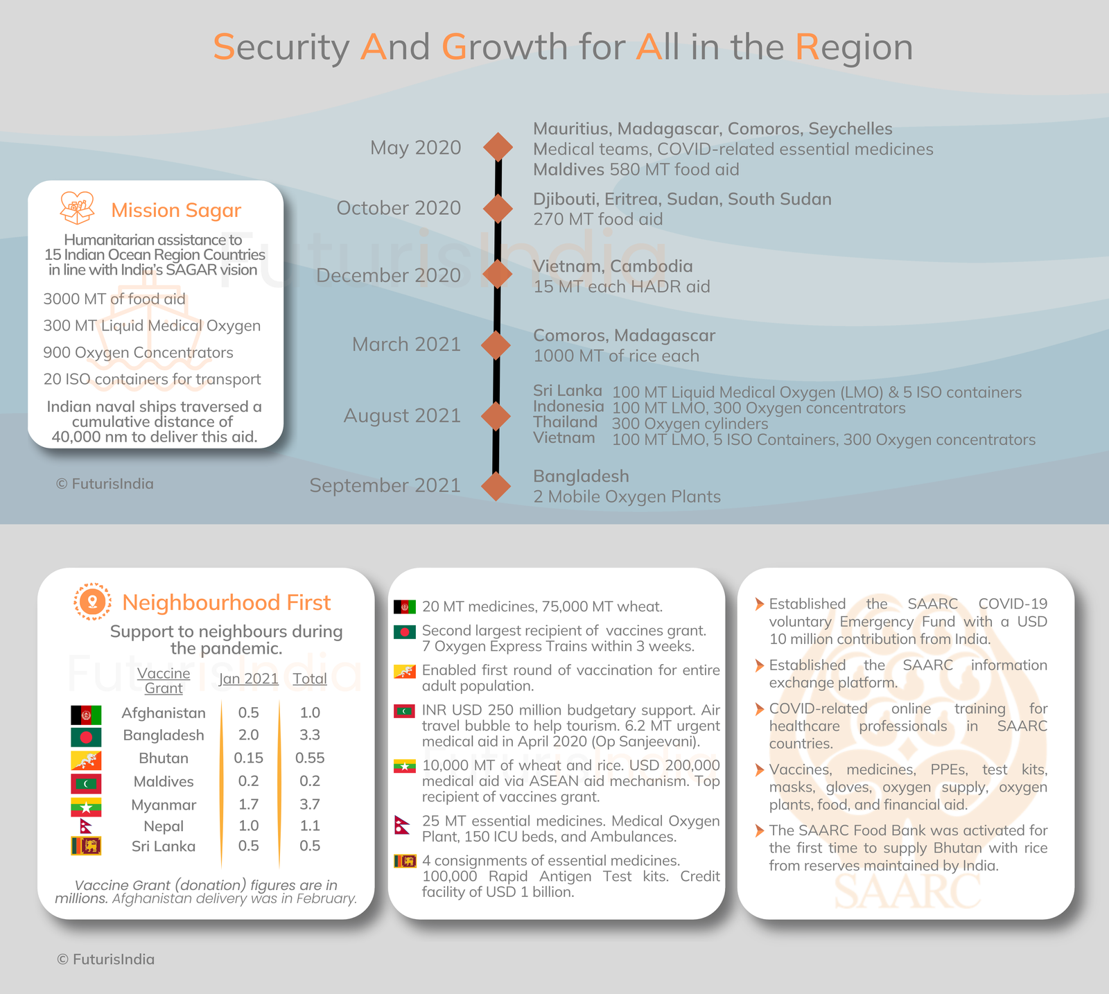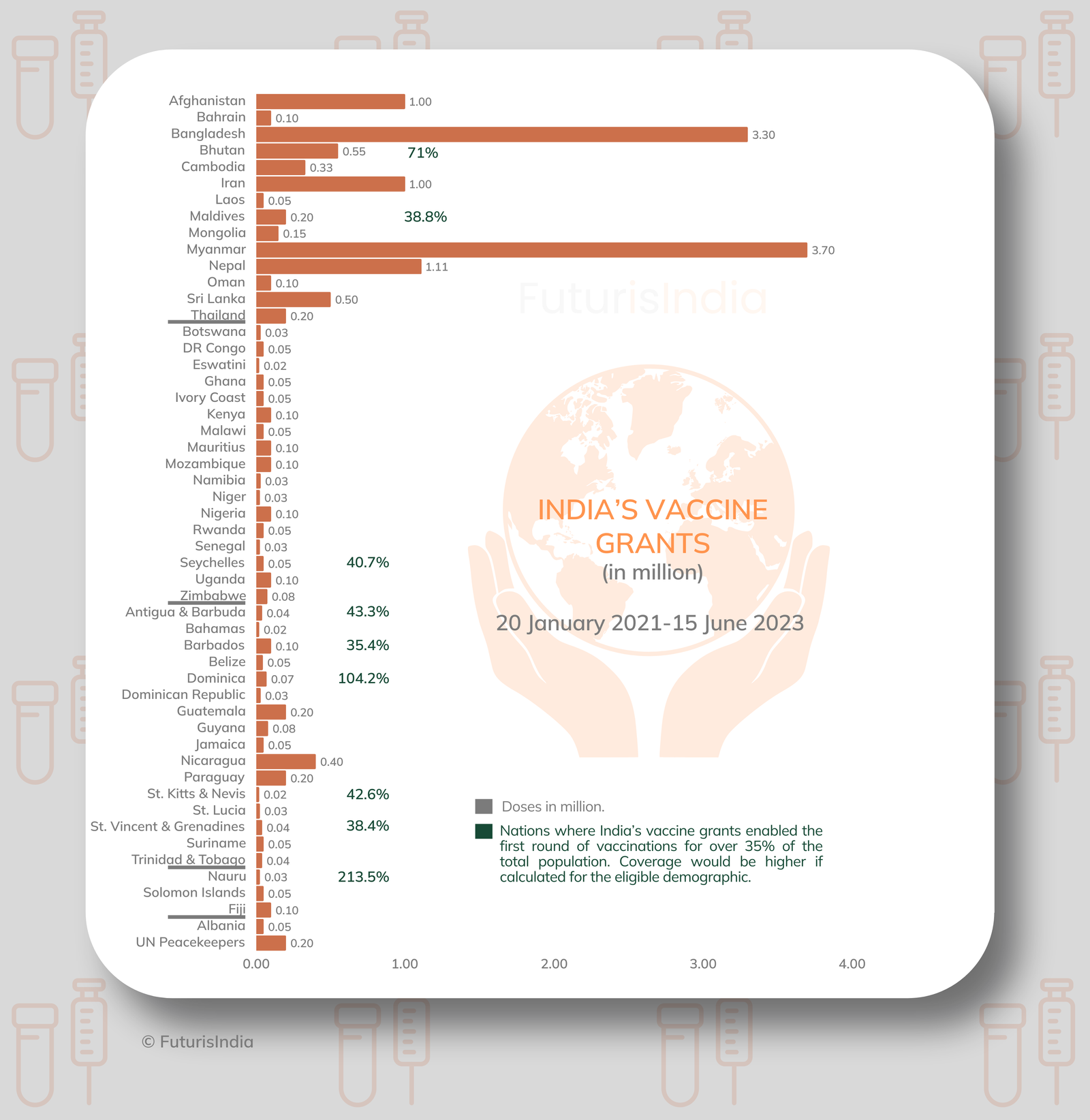 Under its Neighbourhood First policy, India extended timely assistance to countries in South Asia, delivering vaccines, medical and humanitarian supplies, and financial aid. Bhutan and the Maldives were the first recipients of Indian-made vaccines on 20 January 2021, the day Vaccine Maitri was launched. By 2 April 2021, India’s immediate neighbours had received substantial vaccine grants from India – Afghanistan (0.5 million), Bangladesh (3.3 million), Bhutan (0.55 million), Myanmar (2.7 million), Nepal (1.1 million), Maldives (0.2 million) and Sri Lanka (0.5 million).